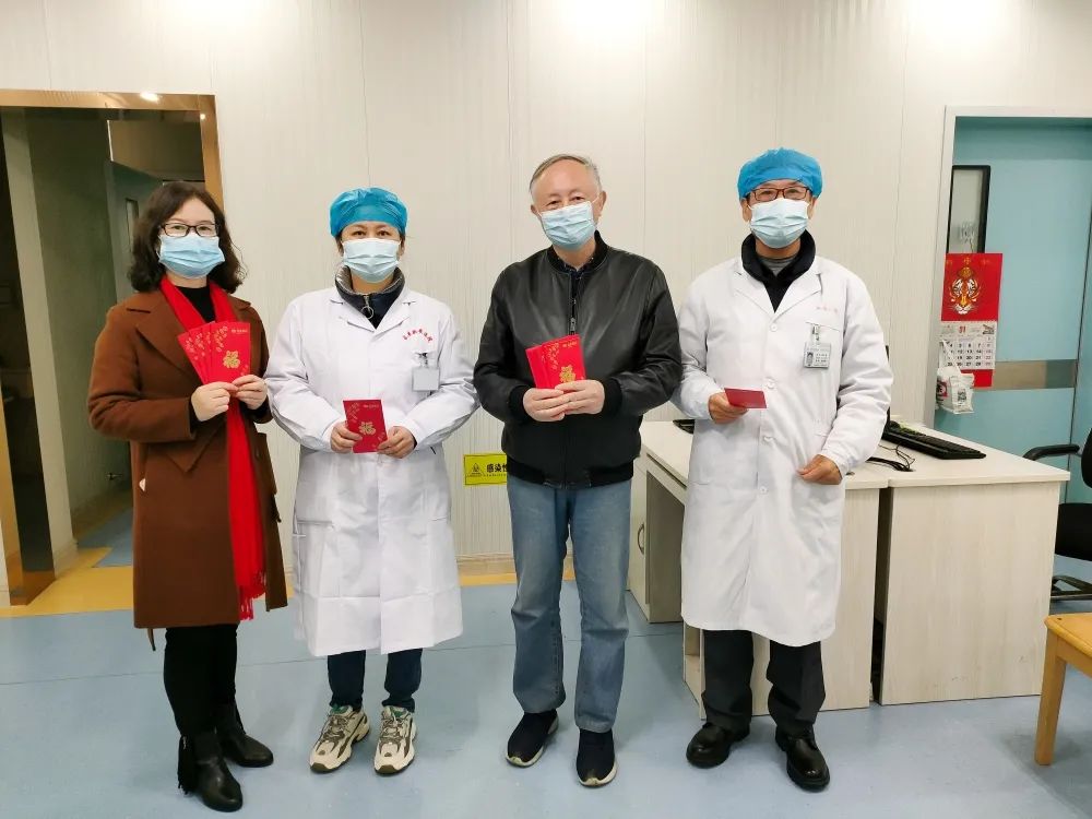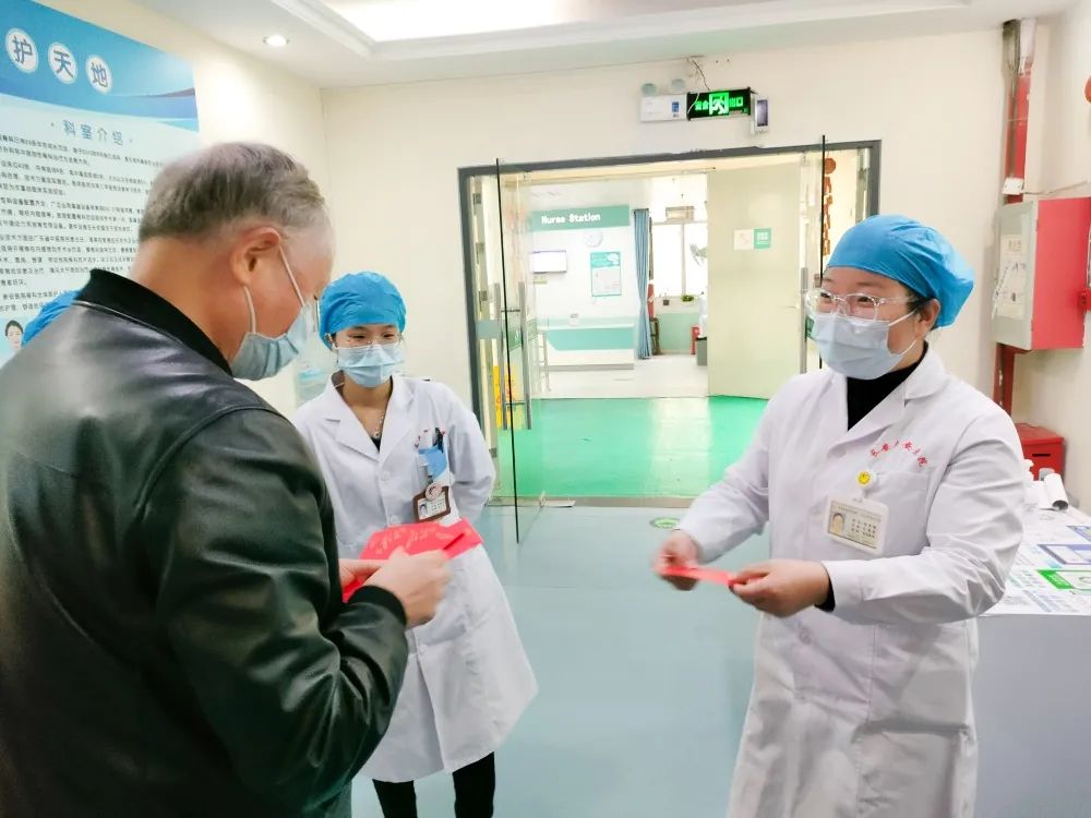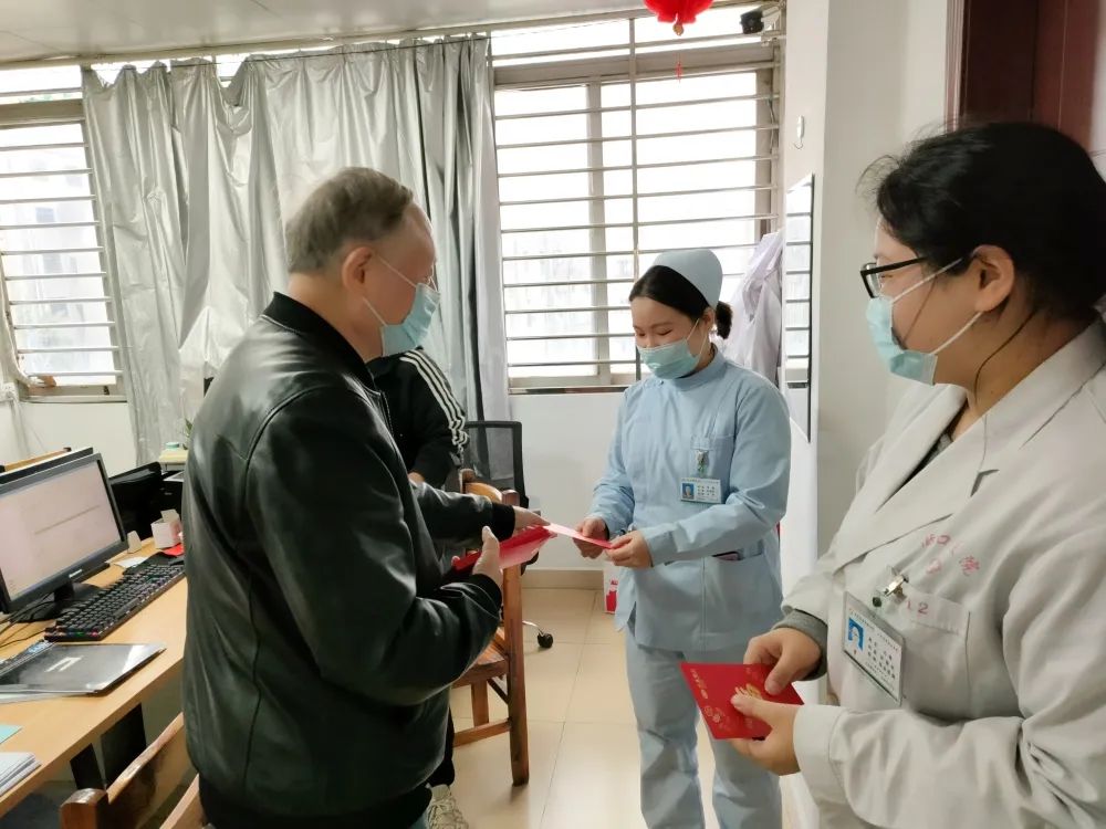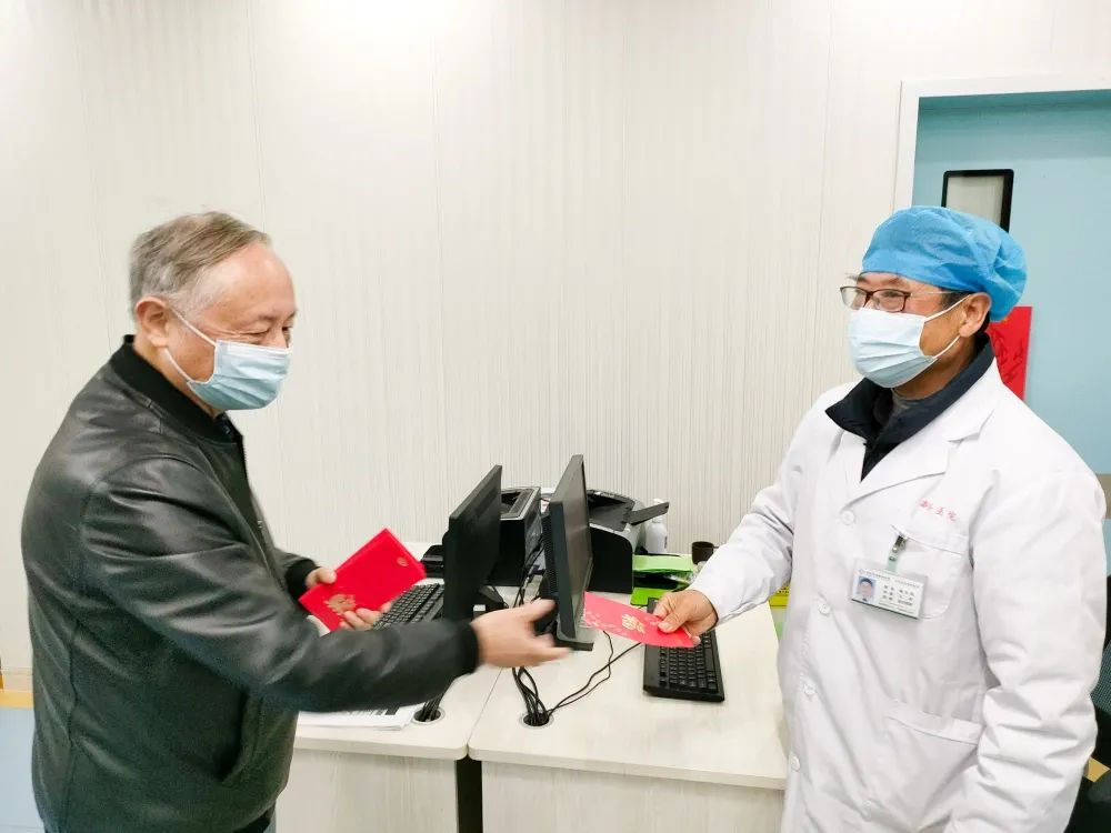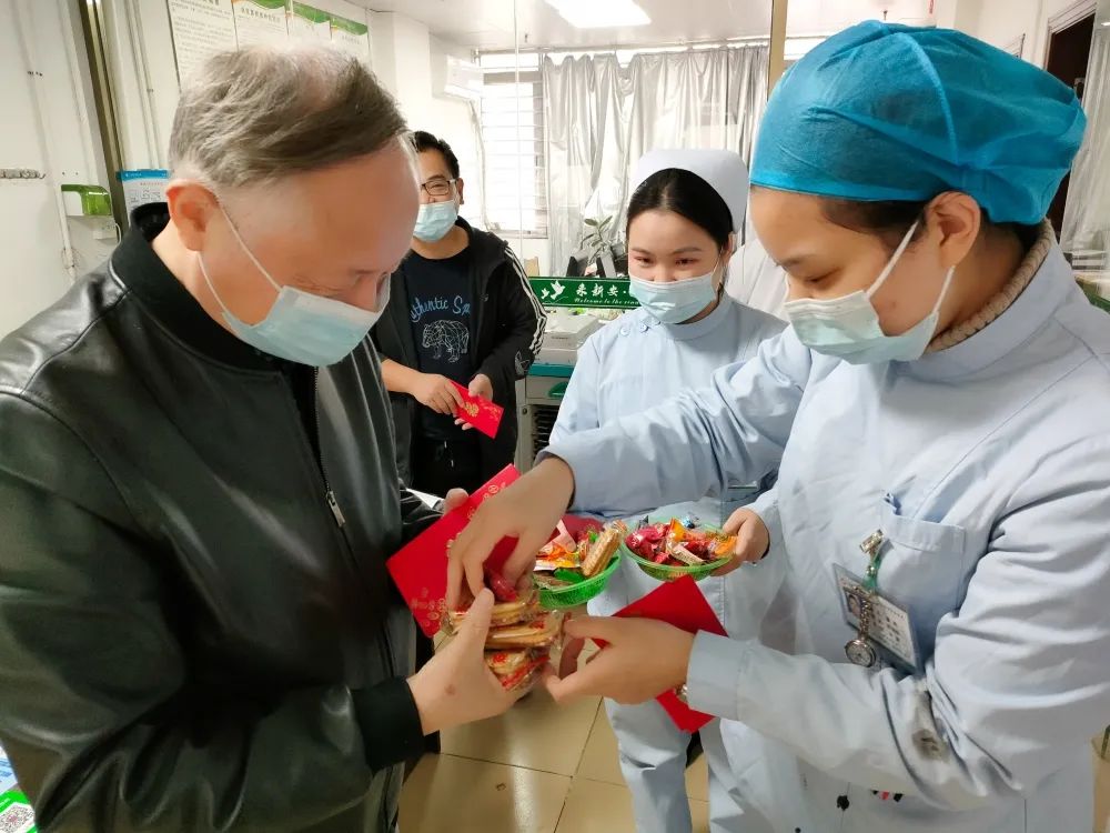 2022年2月1日大年初一,陈立辉院长带领院领导班子一行人(院办、行政办、人事部)代表新安医院,亲切慰问了节日期间坚守在工作岗位上的一线值班人员,向大家致以亲切的问候和诚挚的祝福,并送上新春慰问红包,对春节期间留院治疗的患者家属们也送去了新春的祝福及慰问。
