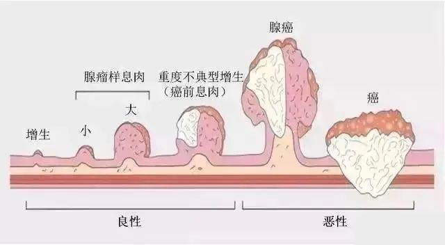 腺瘤性肠息肉,在早期也是良性的,不会产生任何危害和症状;但是,随着它体积的不断变大,就会发生异型增生,最终发生癌变。过程如上图所示。我们只需要在它癌变之前,做个肠镜,找到它找到它,切掉它就可以了,是不是简单到哭??