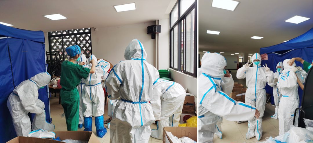 夏日炎炎,队员们穿着密不透风的防护服连续作战,每操作一次,严格消毒一次,没有一丝一毫疏忽。所有队员用实际行动完美诠释了“责任在肩,勇往直前”。无数遍的“来,张开嘴,啊,好嘞”,即使大家再口渴再累,也坚持到脱下防护服的那一刻。