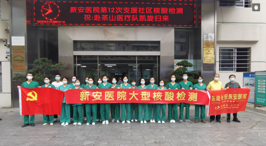 在东莞市疫情防控的关键时刻,按照东莞市全员核酸检测工作的安排部署,3月19日,新安医院积极响应号召,再次选派20人(其中医疗8人、护理12人)组成茶山站核酸采样医疗队,在质控科主任姜在峰带领下,全力支援东莞茶山镇的核酸检测工作。